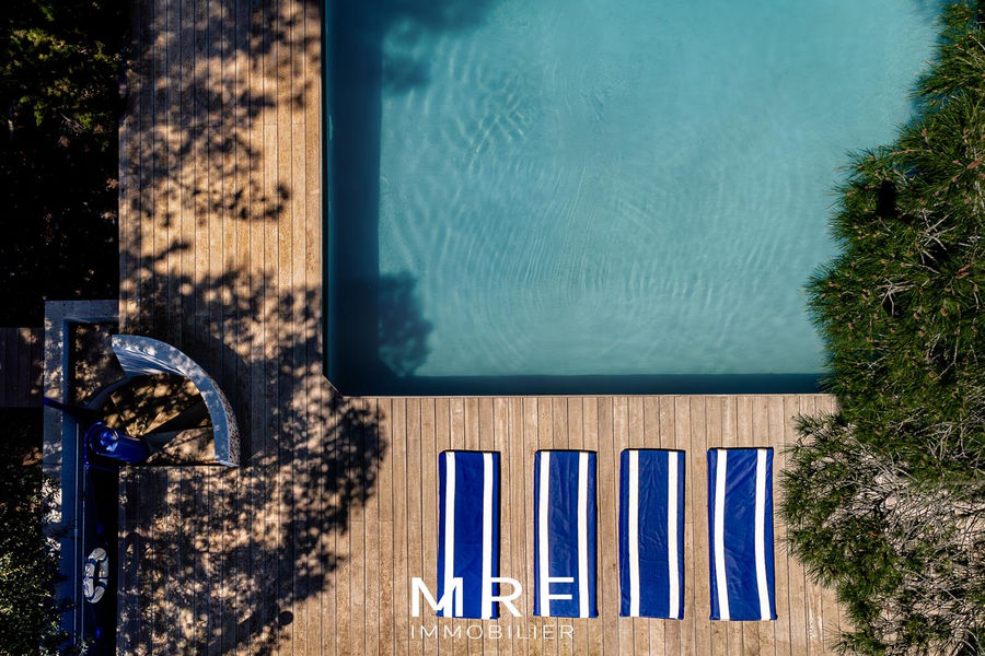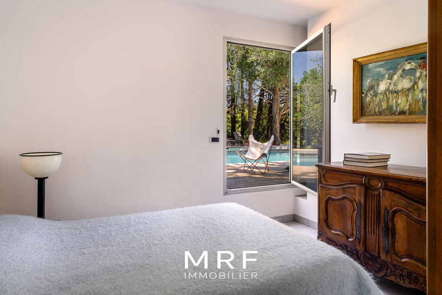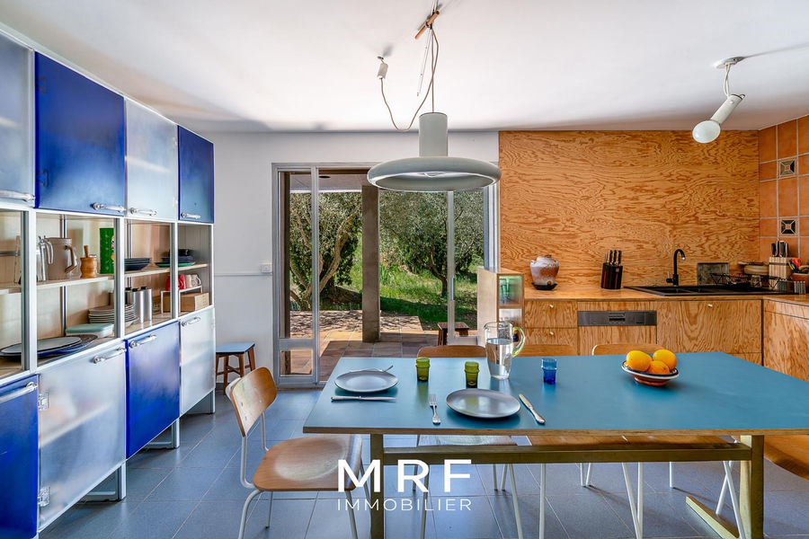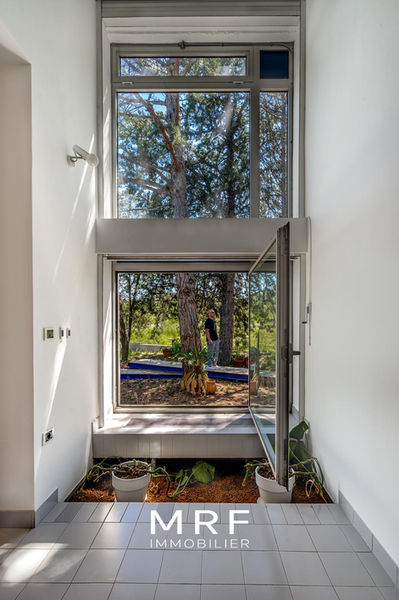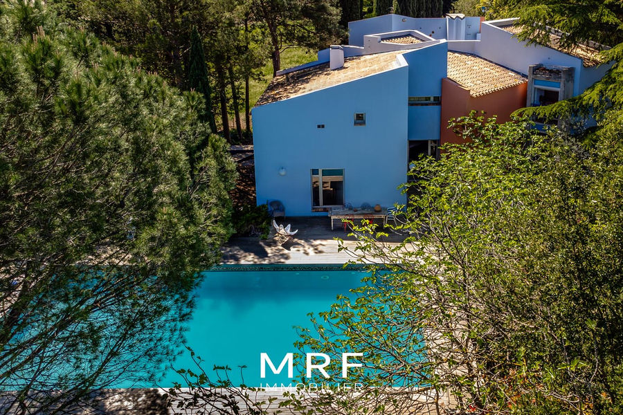 Architecture bioclimatique, cette superbe maison de 250 m² avec dépendance prend place dans le hameau des Milles au cœur d’un écrin végétal de 2 500 m², entre collines et horizon.