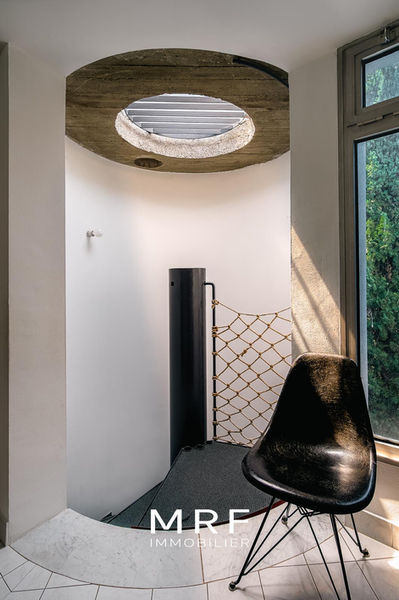 À l’étage, passé un escalier hélicoïdal à la lumière zénithale, trois autres chambres traitées en suites avec rangements profitent d’un accès privilégié au solarium où la vue surplombe les environs.